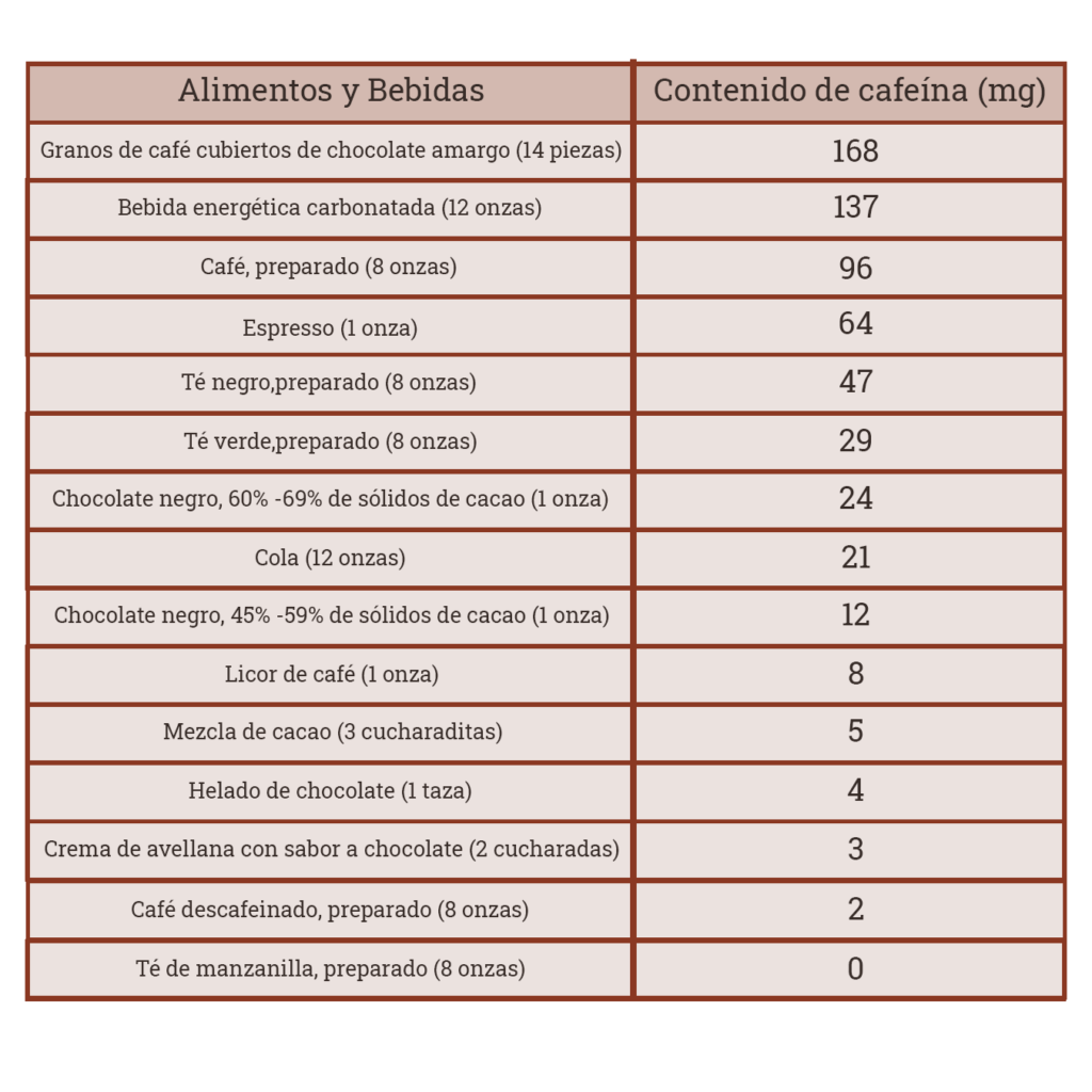 Nota: Las cantidades son aproximadas. El contenido de cafeína puede variar, especialmente en café y espresso, según los métodos de preparación.